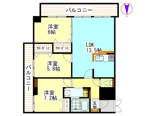 洋室5.8畳 洋室6畳 洋室7.2畳 LDK13.5畳 |