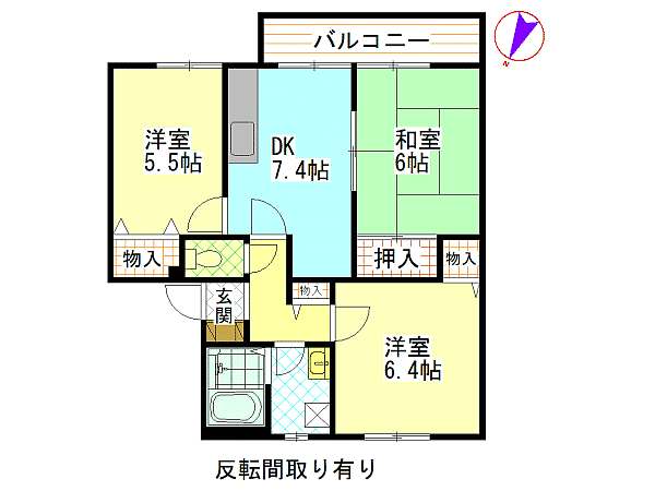 和室6畳 洋室5.5畳 洋室6.4畳 DK7.4畳 |